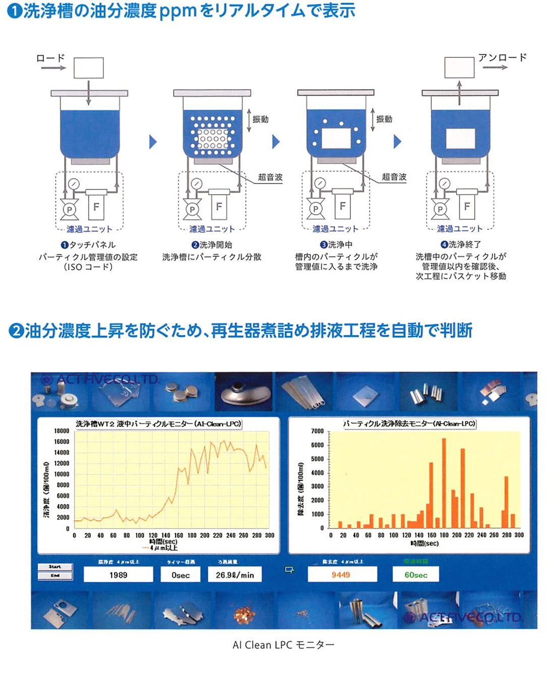 超音波ユニットの能力劣化を監視します。槽内に設けた測定子で音圧の変化を定点観測。設備能力と洗浄品質維持のために超音波の性能を監視します。
